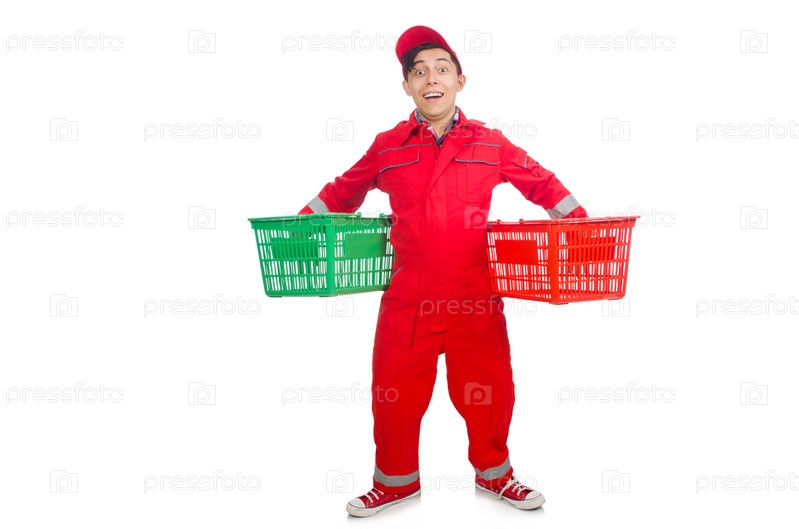 Человек в красном комбинезоне с продуктовыми корзинами