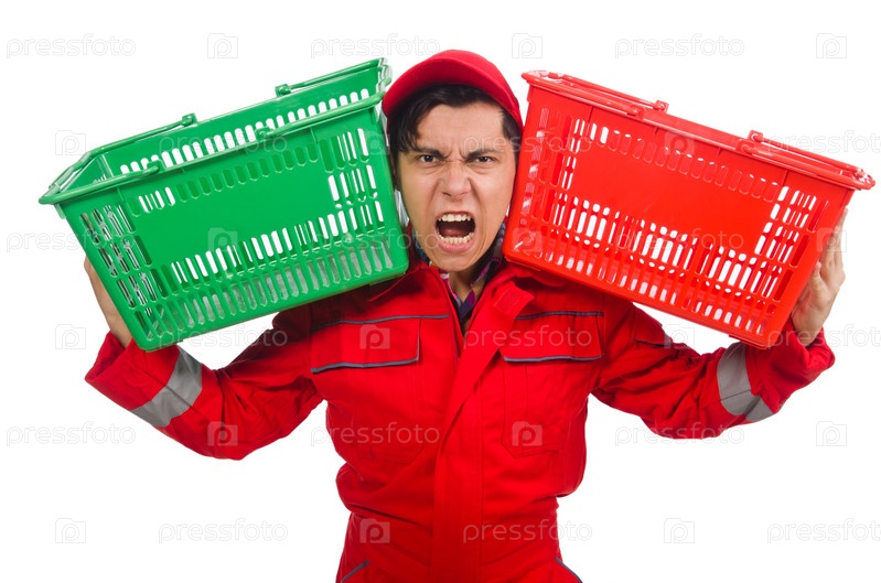 Человек в красном комбинезоне с продуктовыми корзинами
