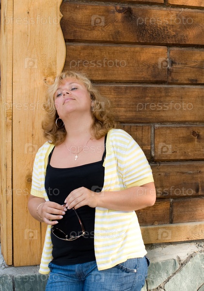Портрет молодой женщины возле стены деревенского дома