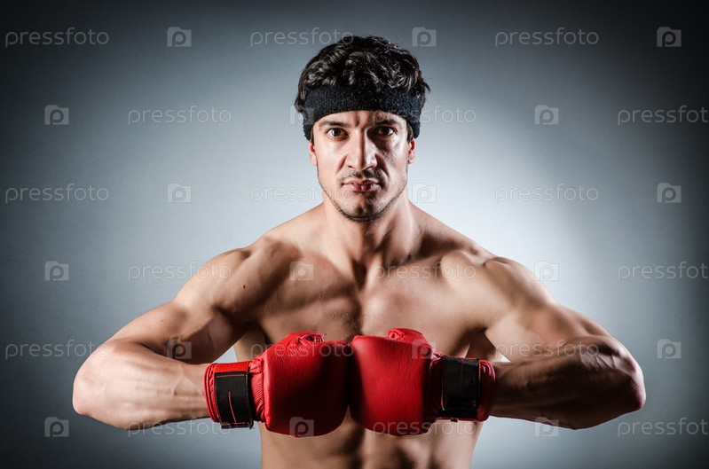 Мускулистый боксер в красных перчатках