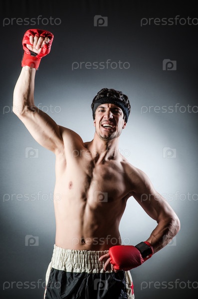 Мускулистый боксер в красных перчатках