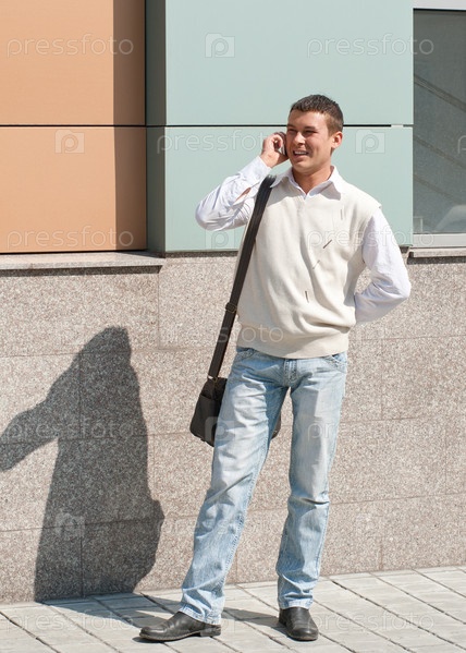 Молодой мужчина разговаривает по мобильному телефону на улице