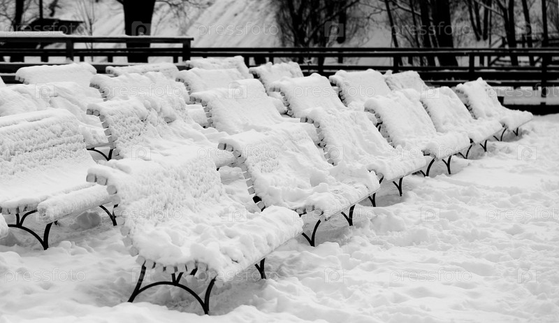 Покрытые снегом скамьи