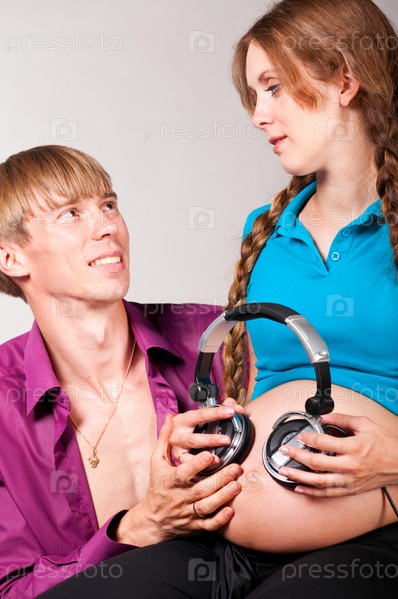 Мужчина и беременная женщина держат наушники на женском животе