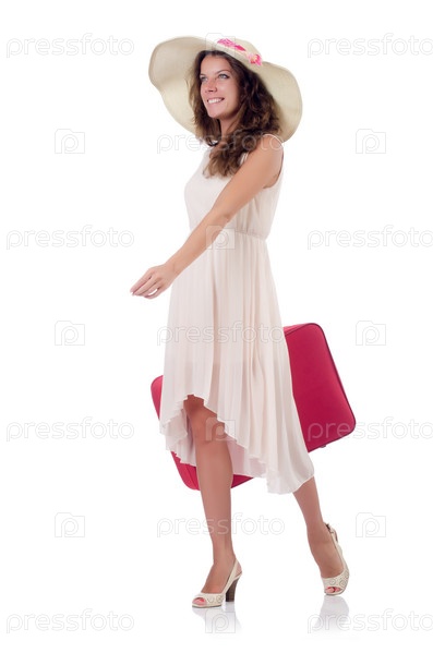 Женщина с чемоданом на белом фоне