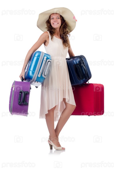 Женщина с чемоданом на белом фоне