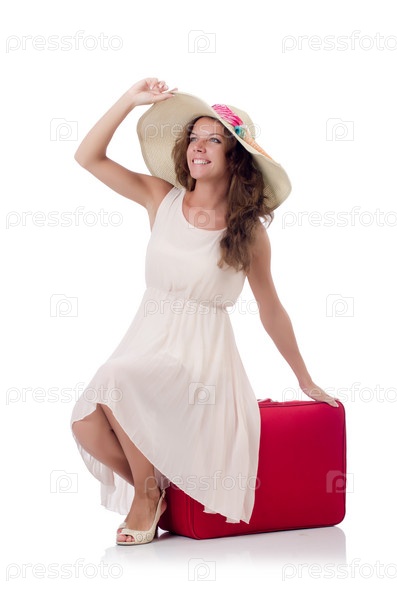 Женщина с чемоданом на белом фоне