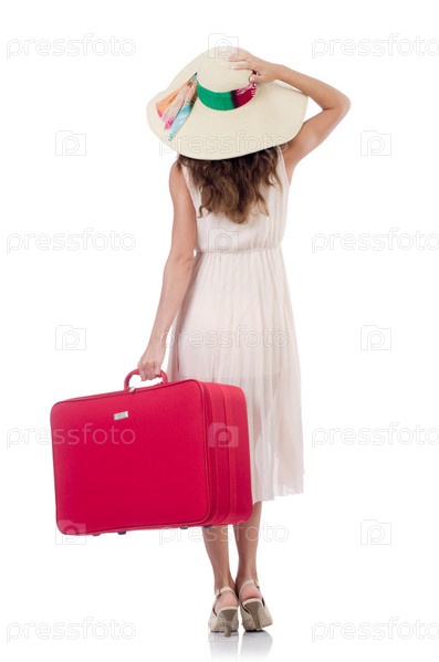 Женщина с чемоданом на белом фоне