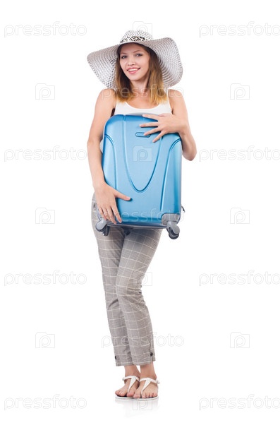 Женщина с чемоданом на белом фоне