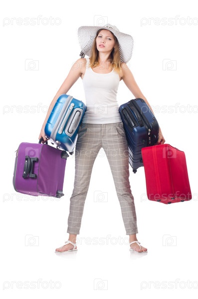 Женщина с чемоданом на белом фоне