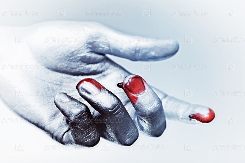 Мужская рука в серебряной краске с каплями крови на пальцах