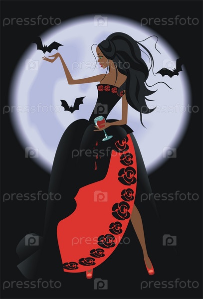 Черноволосая колдунья на фоне полной Луны в окружении летучих мышей