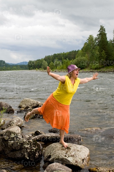 Портрет женщины, стоящей на одной ноге на берегу реки