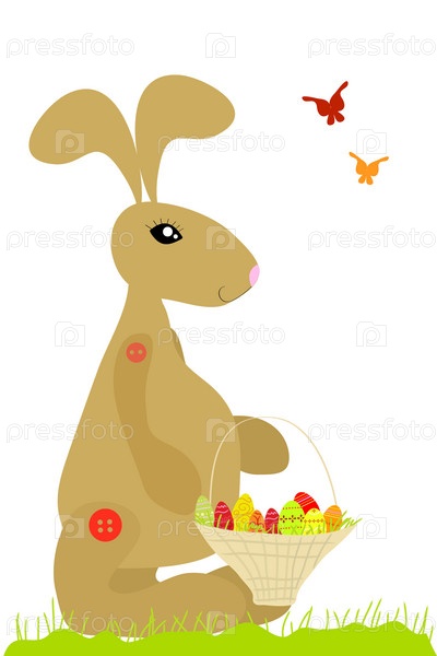 Коричневый кролик держит корзину с пасхальными яйцами, векторная иллюстрация
