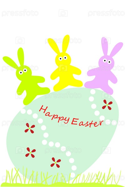 Три разноцветных кролика на большом пасхальном яйце, векторная иллюстрация