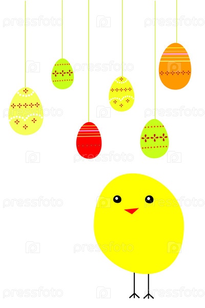 Желтый цыпленок и пасхальные яйца, векторная иллюстрация
