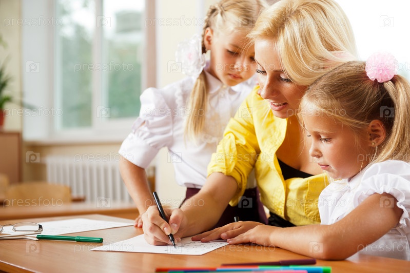 Учительница помогает школьницам выполнить задание