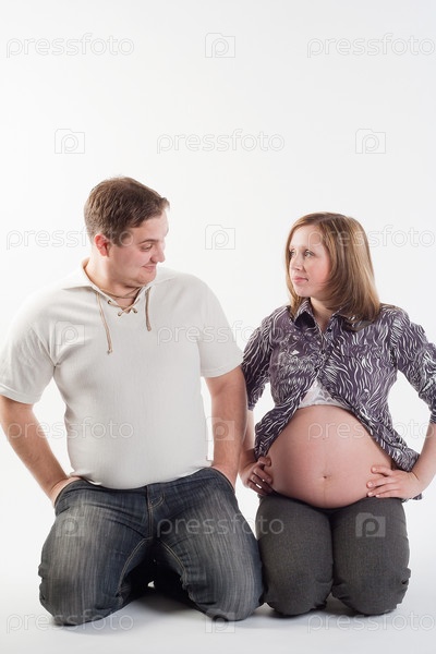 Беременная женщина с мужем сидят рядом на коленях