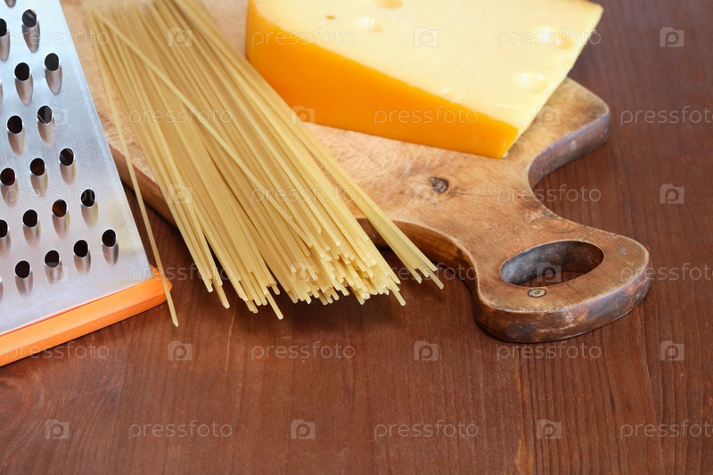 Сырье спагетти возле терки и сыр на деревянной разделочной поверхности