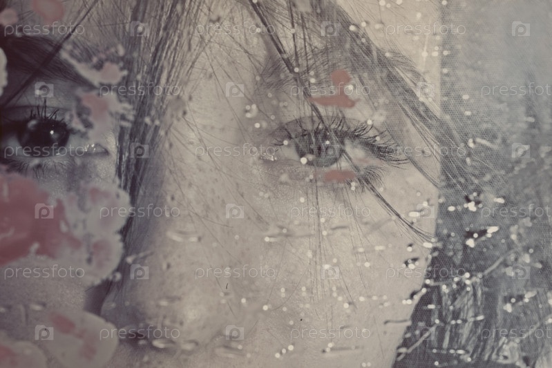 Красивая женщина за мокрым стеклом