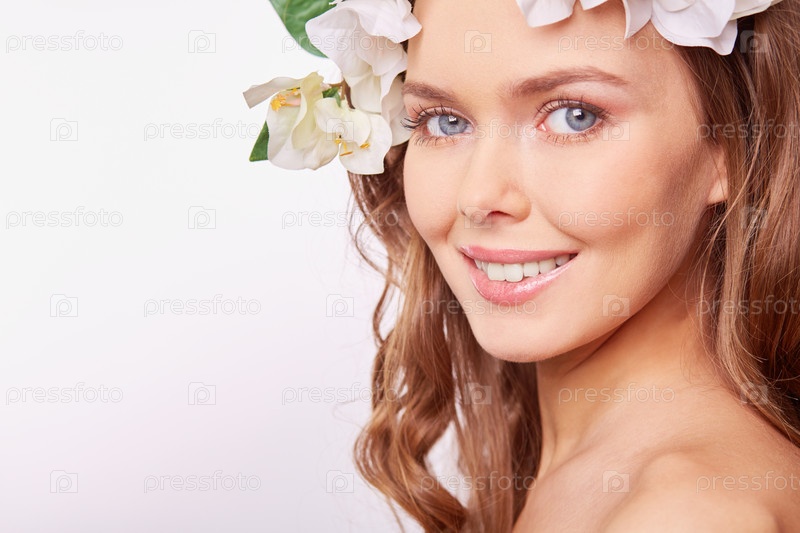 Красивая женщина с цветами в волосах