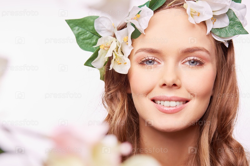 Красивая женщина с цветами в волосах