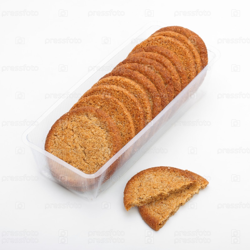 Сдобное печенье в пластиковом контейнере на белом фоне