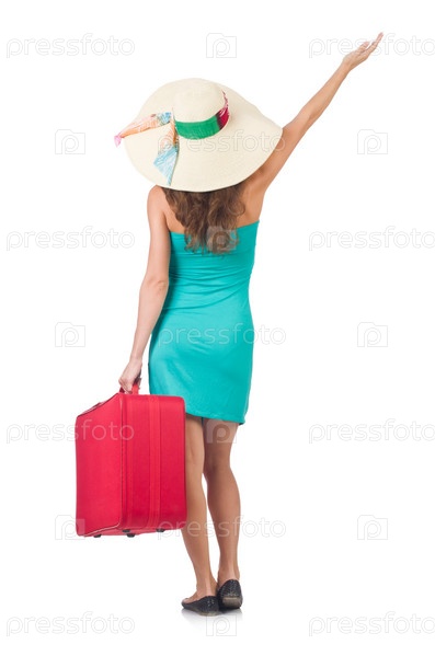 Туристка с чемоданом, изолированная на белом