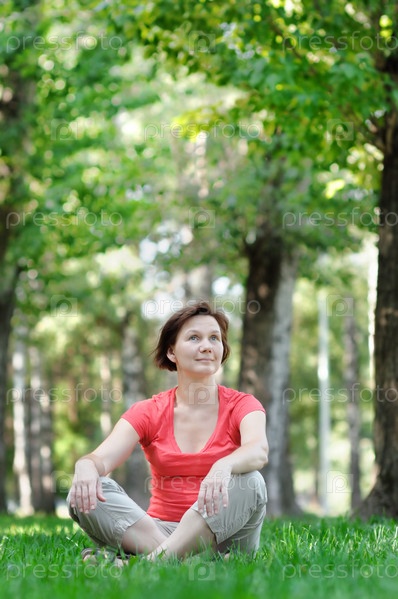 Женщина, сидящая на зеленом газоне