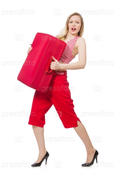 Туристка с багажом на белом фоне