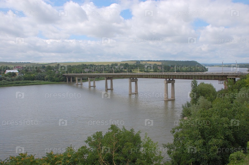 Пейзаж с современным мостом через широкую реку