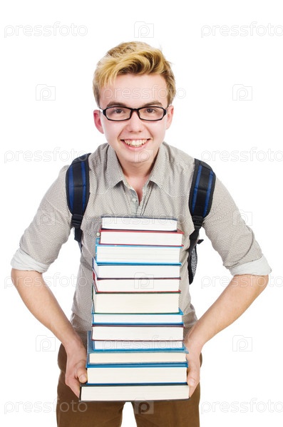 Смешной студент со стопкой книг