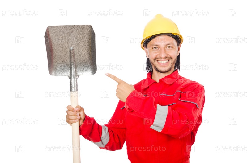 Человек в красном комбинезоне с лопатой