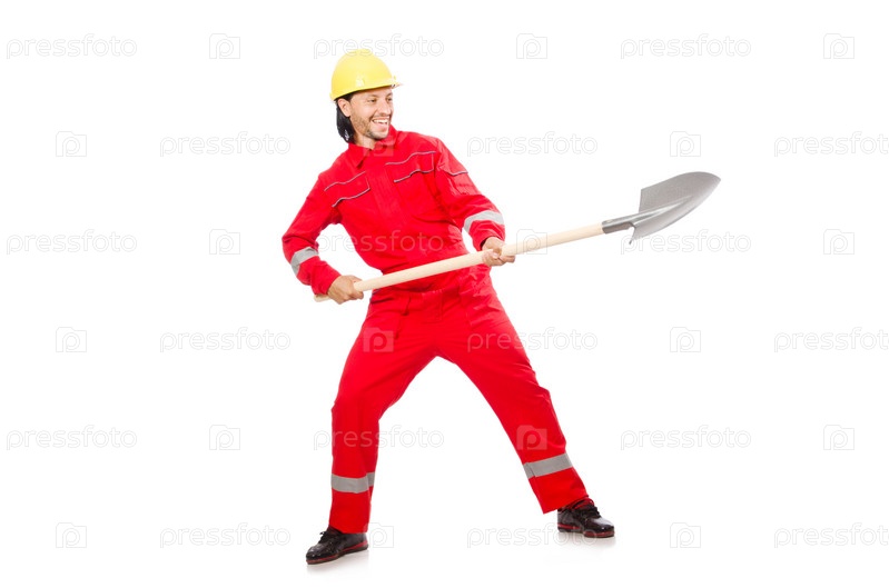 Человек в красном комбинезоне с лопатой