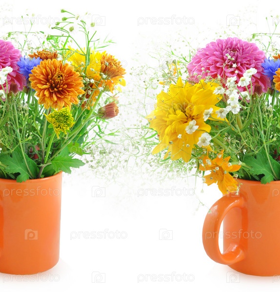 Два букета цветов в кружках, изолированные на белом фоне