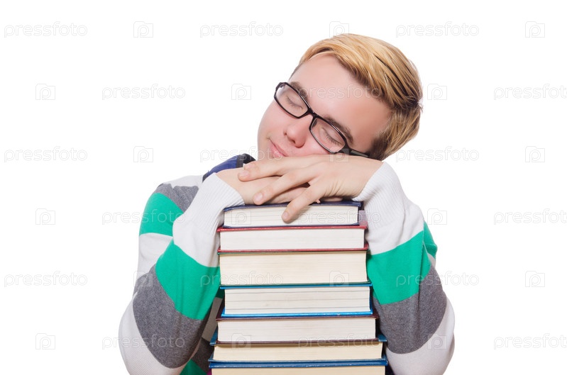 Смешной студент со стопкой книг