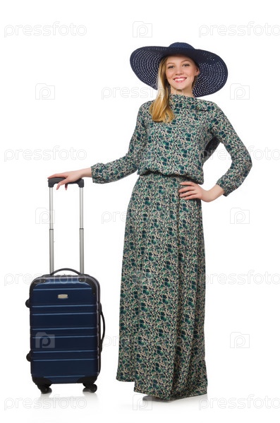Туристка с багажом на белом фоне