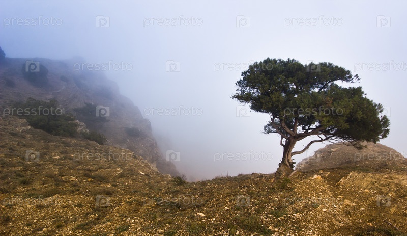 Дерево на скале в туманную погоду