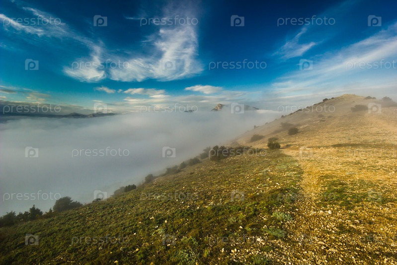 Ползущий туман в горной долине на закате