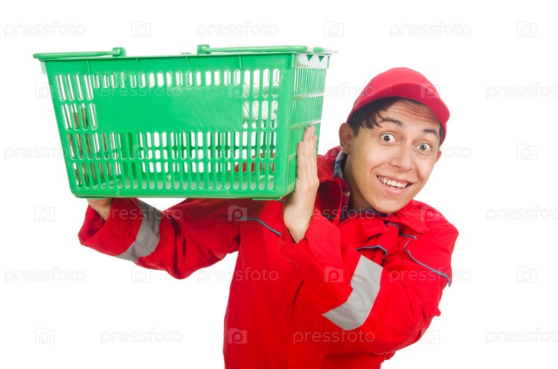 Человек в красном комбинезоне с продуктовой тележкой