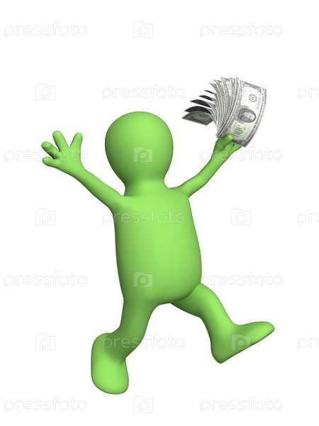 Счастливый маленький человек с пачкой долларов в руке