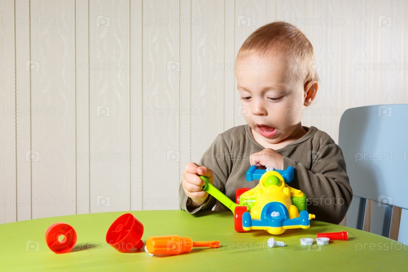 Маленький мальчик ремонтирует машинку