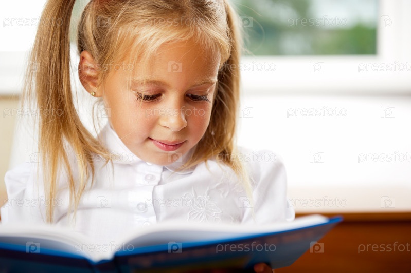Маленькая девочка сидит за столом с книгой