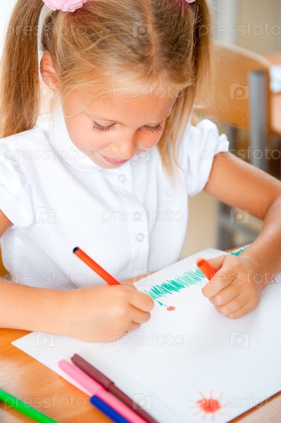 Маленькая девочка рисует в классе