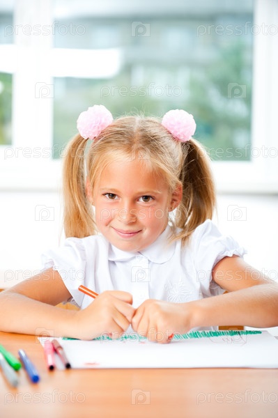 Маленькая девочка рисует в классе
