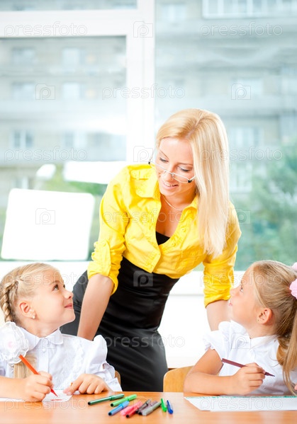 Молодая учительница помогает своим ученикам