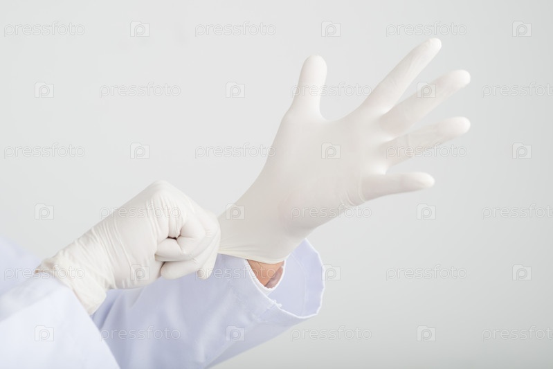 Врач надевает резиновые перчатки