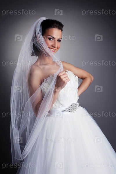 Веселая модель позирует в свадебном платье