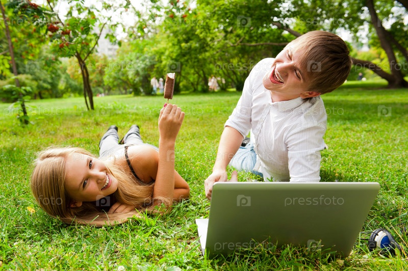 Студенты колледжа в парке с ноутбуком