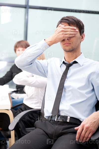 Молодой бизнесмен, закрывающий лицо рукой